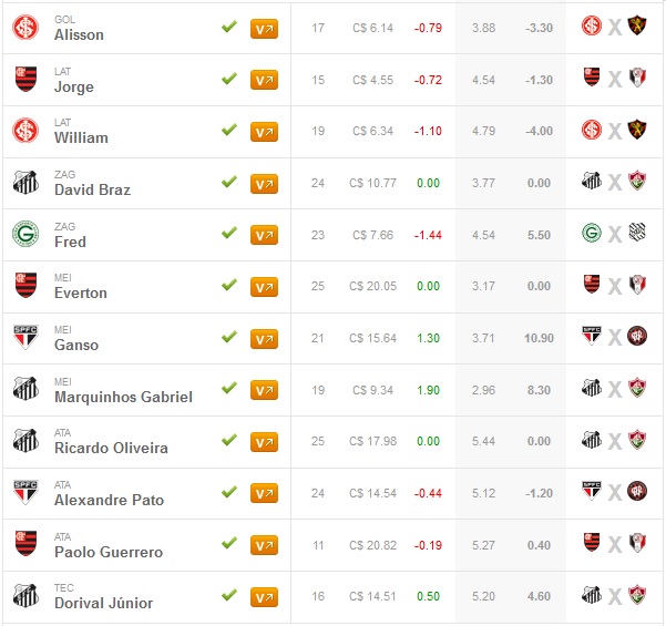 MEI - Ganso (São Paulo): Está em boa forma e tem jogado mais próximo do ataque. Com excelente passe, todo jogo deixa seus companheiros de ataque na cara do gol, o que pode dar assistências preciosas. O único problema é arriscar nesse jogador e o Osório inventar de poupar. Ficaremos na torcida.