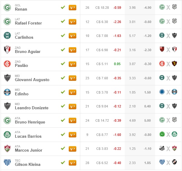 Vale ressaltar que o time não terá margem de preço fixo, afinal, de acordo com as particularidades da rodada é que podemos determinar as boas opções para valorização. Com isso, o Tio Patinhas Brasil vai a campo com os seguintes jogadores: