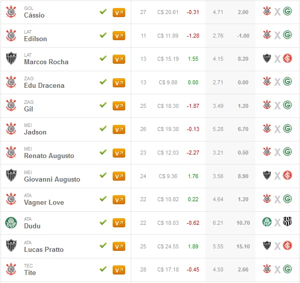 Meia - Jadson (Corinthias) e Renato Augusto (Corinthians): Os meio-campistas do time da capital poderão pontuar muito bem com assistências e gols. Jadson por ser um jogador de muita visão de jogo e que pode pontuar com boas assistências e gols. Renato Augusto, por ter muita qualidade no passe, podendo assim pontuar com assistências.