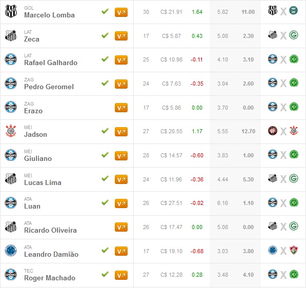 O time sugerido acima para esta 31ª rodada do Cartola FC custa ao todo a quantia de C$ 187,22 e tem a seguinte distribuição por clubes do Campeonato Brasileiro: Grêmio (6), Santos (3), Corinthians (1), Ponte Preta (1) e Cruzeiro (1).