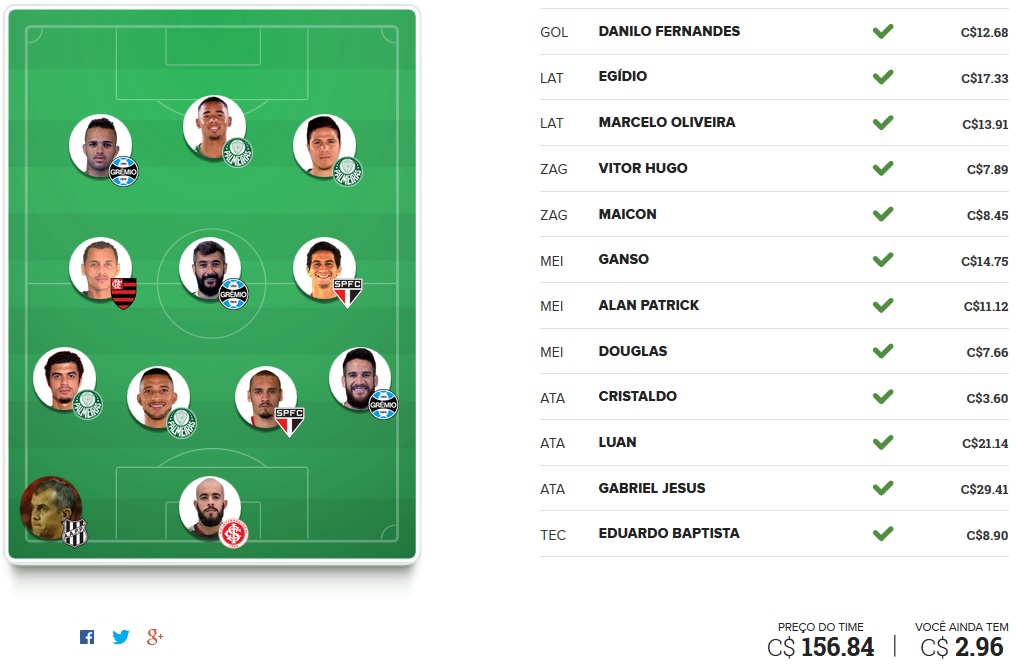 O time sugerido acima para esta 10ª rodada do Cartola FC custa ao todo a quantia de C$ 156,84 e tem a seguinte distribuição por clubes do Campeonato Brasileiro: Palmeiras(4), Grêmio (3), São Paulo (2), Ponte Preta (1), Internacional (1) e Flamengo (1).
