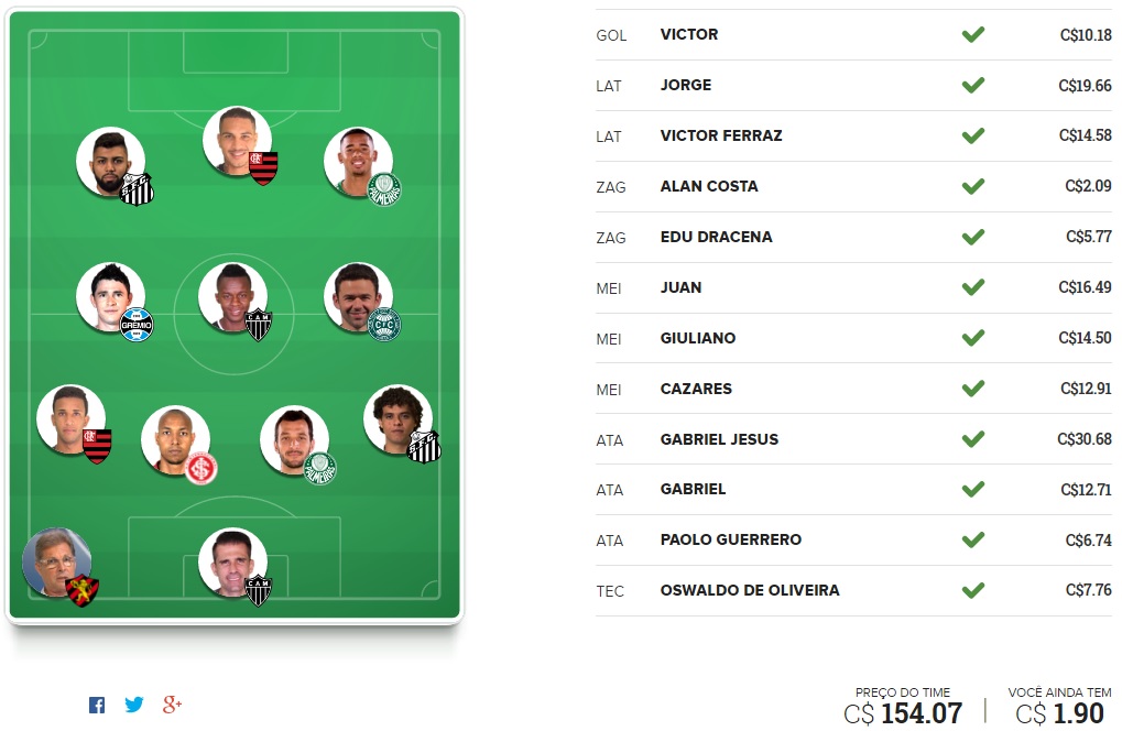 Lembrando que nessa 11ª rodada montamos um time de só de apostas, pensando na pontuação e também na valorização e acumulo de cartoletas para o restante da temporada do Cartola FC. O Surpresa FC Brasil fez 37.02 pontos na rodada #10 e vem para esta rodada #11 do Cartola FC com a formação 4-3-3 e custou C$ 154,07. Vamos às explicações: