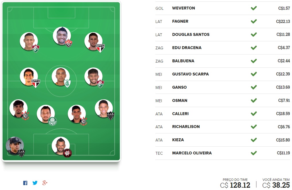 Na nossa linha de frente optamos por Richarlyson (Fluminense) e Calleri (São Paulo) para fazerem dupla com nossos meio campistas. Richarlyson ainda não fez nenhum gol e tem tudo para quebrar essa marca negativa e Calleri é o artilheiro do Soberano no ano e mesmo tendo muito trabalho frente a nova zaga do Mengão, pode balançar as redes e homenagear novamente seu amigo que se foi. Fechamos com Kieza (Vitória) que está em jejum de gols, mas já tem 4 gols na conta e uma média de 3.66 pontos. É o goleador do Rubro Negro Baiano e pode ser um bom nome para marcar nessa rodada.