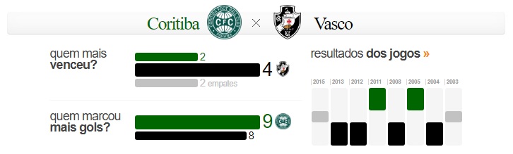 O Confronto entre Coritiba e Vasco aconteceu pela última vez na rodada final do Brasileirão de 2015 onde foi decretado o 3º rebaixamento do Vasco da Gama. Nessa rodada, o confronto será disputado no Estádio Durival de Britto, mas mesmo assim, longe do Couto Pereira e com o mando de campo do Coxa, o Gigante da Colina leva vantagem historicamente no Duelo.