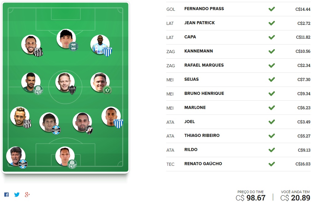Thiago Ribeiro (Santos) é o cara que ninguém escala, então é ele quem vai mitar. Rildo (Coritiba), ops, Riberildo é o nome da fera, depois da atuação de hoje contra a Macaca o Barcelona vai contratá-lo para o lugar do Neymar. E fechamos com Joel (Avaí), o Cruel, dois gols do camaronês, Cássio com -4 e Balbuena e Guilherme Arana com -1, podem printar e cobrar.