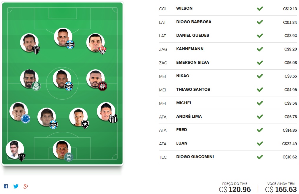 Outro trio de respeito para mitar pela terceira vez seguida com nossos atacantes: André Lima (Vitória), Luan (Grêmio) e Fred (Atlético-MG). André Lima tem a mamata da defesa da Chape pela frente e Luan e Fred vão brocar no São Paulo e Vasco, respectivamente.