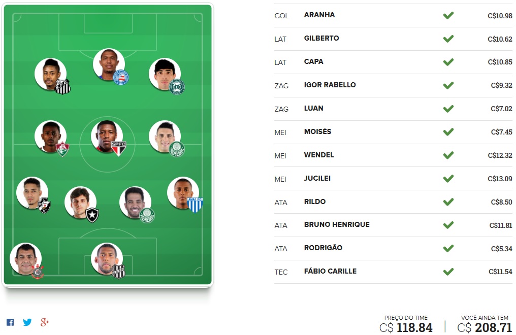 Obs: Essa escalação só almeja o ganho de cartoletas. Caso o seu foco seja pontuação, basta procurar pela Seleção FC Brasil #22 e pelo Mito Confirmado FC #22 na nossa página inicial.