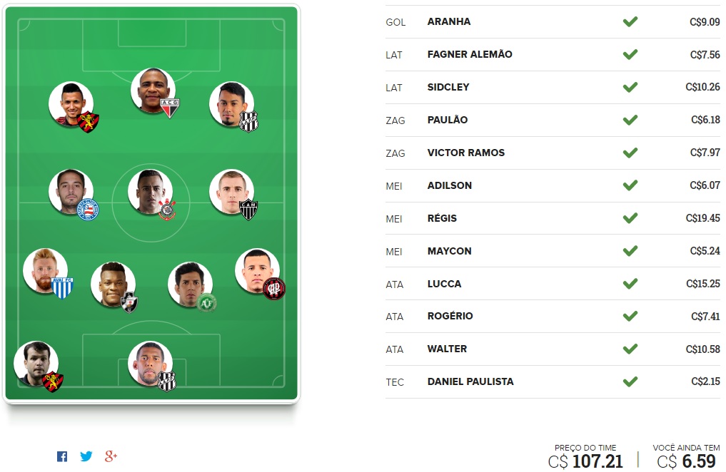 Cazares e Fred do Atlético Mineiro, um meia e um atacante, entre os jogadores mais escalados da rodada, que afronta é essa com nossos zikas? Toma aqui o Aranha Caranguejeira (Ponte Preta) para soltar pelo em vocês seus moleques! 7 defesas difíceis e 2 pênaltis defendidos por Aranha vai acontecer contra o Galo, anotem aí, vai até passar o Neymar e será o maior pontuador da história do Cartola FC com 40 pontos, confira aqui a lista, já podem colocar a fotinha do Aranha na primeira posição por favor. Você já viu um time com 4 laterais como prováveis? Pois é, o Avaí tem 4 laterais como prováveis e pelo último jogo contra o São Paulo vimos que Diego Tavares (LAT) tem jogado mais avançado, e como tem muito cartoleirinho aí que vai de Reinaldo (Chapecoense), ele é um bom nome para tirar o saldo de gols desse povo. Sidcley (Atlético Paranaense) foi escolhido pelo nome, diferente né? Então é zika! Na zaga, o terror está montado, Caveirão, Bicho doido, Pika das Galáxias, inventor da bicicleta ergométrica Paulão (Vasco) para acabar com as gracinhas do Ceifador e garantir 16 pontos de RBs. Fechamos com ..jfoan dahao..h vi..cti..ra.som da.r, desculpem, até tremi para escrever esse nome: Victor Ramos (Chapecoense). Sem justificativa, só se benzer mesmo: em nome do pai, do filho e do Espírito Santo, amém!