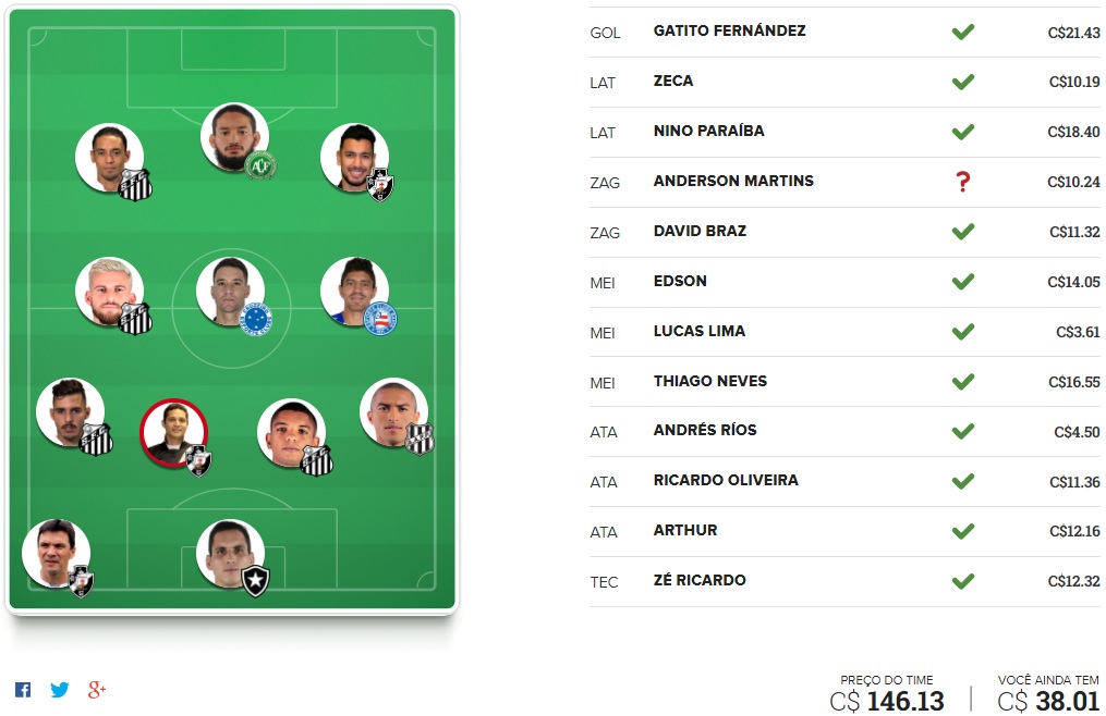 O Pastor vem jogando muito nessa reta final de campeonato e compensando com gols, Ricardo Oliveira (Santos), não tem como deixa-lo de fora contra o último colocado da tabela, é 2 tentos e 15 pontos na conta, podem printar e cobrar. Para continuar a freguesia do Fluminense contra a Chapecoense, Arthur (Chapecoense). E fechamos com Andrés Rios (Vasco), que em mais de 10 anos de carreira não passou de 30 gols, mas só nesse campeonato já fez 2 e ainda vem pontuando bem com roubadas de bola e finalizações, vive uma boa fase o argentino.
