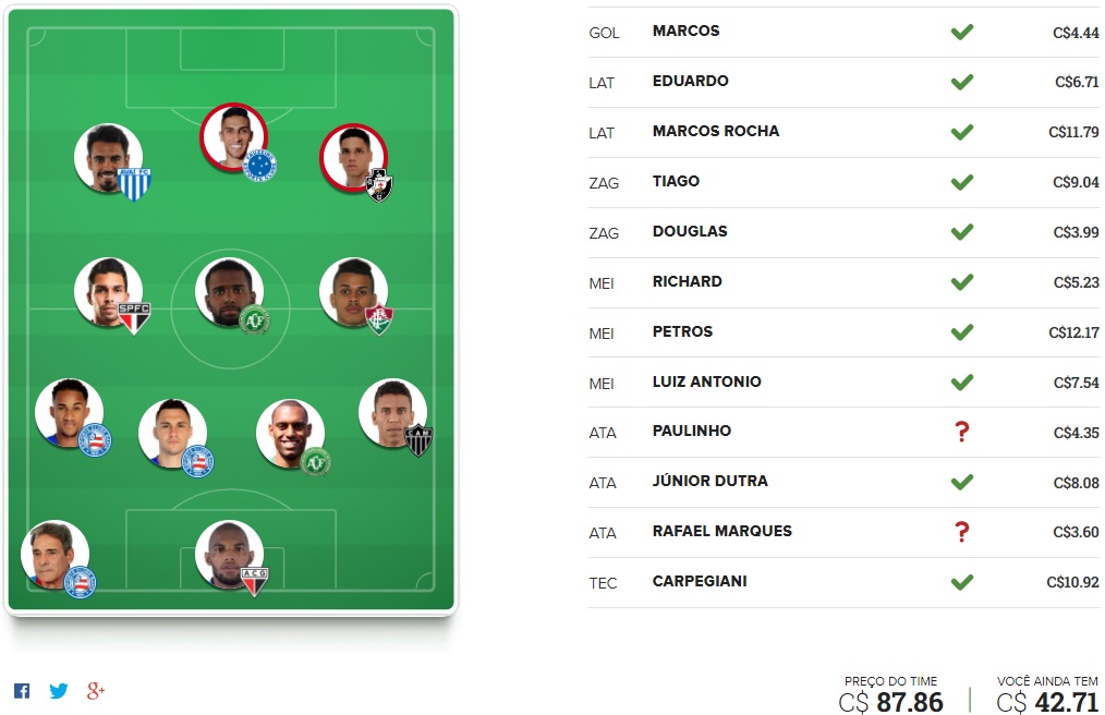 A maior revelação do futebol brasileiro em 2017 é Paulinho (Vasco), que é muito melhor que o Neguebinha lá do Flamengo, e os cartoleiros zé ruelas ainda vão escalar o Andrés Rios achando que aquele argentino caneludo vai fazer gol no Vitória, como pode isso gente. Outra dica importante para os mais dotados de inteligência cartolistica: nunca apostem na zaga do Coritiba, os caras são ruim demais, então vai um Júnior Dutra (Avaí) pra comprovar isso. Benzemarques (Cruzeiro) faz logo 3 no Furacão e afasta de vez a má fase, pede música no Fantástico e mostra esse sorrisão lindo de porcelana e Colgate Total 12 pra galera.