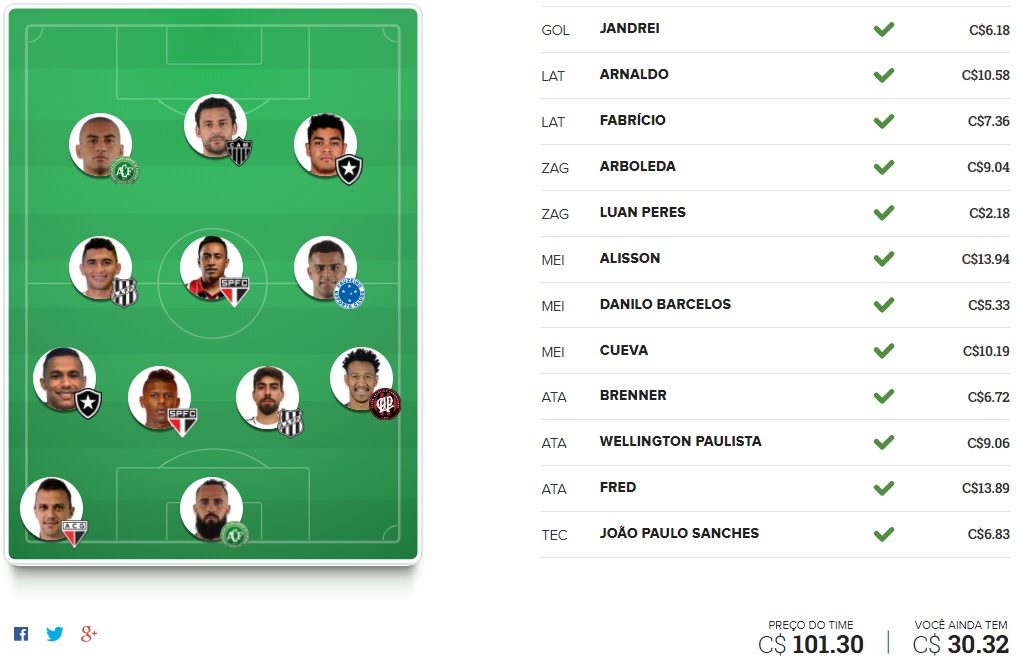 Nossa querida Chapecoense, estamos próximos de completar 1 ano daquela fatídica tragédia, e os cartoleiros estão achando que ela vai se abater contra o Bahia e tomar goleada, vai vendo, cata tudo aí Jandrei (Chapecoense) em homenagem ao Danilo. Fabricio Bicho Doido (Atlético-PR) e Arnaldo (Botafogo) vão fazer mais de 10 pontos fácil. O filho do Luan Santana com a Carla Peres, Luan Peres (Ponte Preta) e o catador de Borboleta Arboleda (São Paulo) fecham nossa defesa.