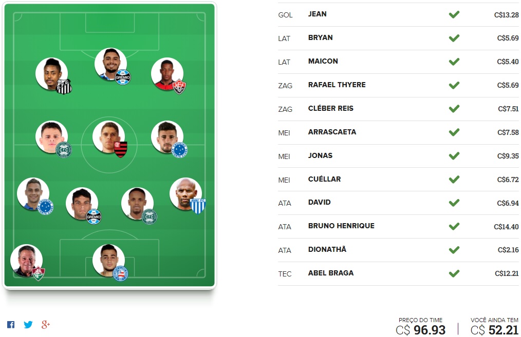 O time apresentado pode sofrer alterações até o fechamento do mercado em função de desfalques de última hora. Fique à vontade para emitir sua opinião, fazer comparações e citar outros nomes. Alertamos a todos que a nossa intenção não é a de sugerir um time perfeito, mas sim montar um bom time dentro das propostas do quadro.
