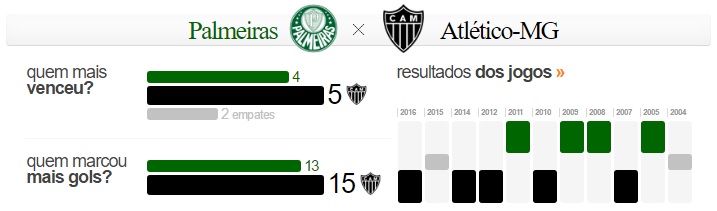 Esse duelo Tradicional do nosso Futebol Brasileiro é bem equilibrado, porém o Galo de Minas é um adversário indigesto contra o Porco, tem mais vitórias jogando como visitante. Já o Verdão não vence o Atlético, jogando em casa, desde 2011.