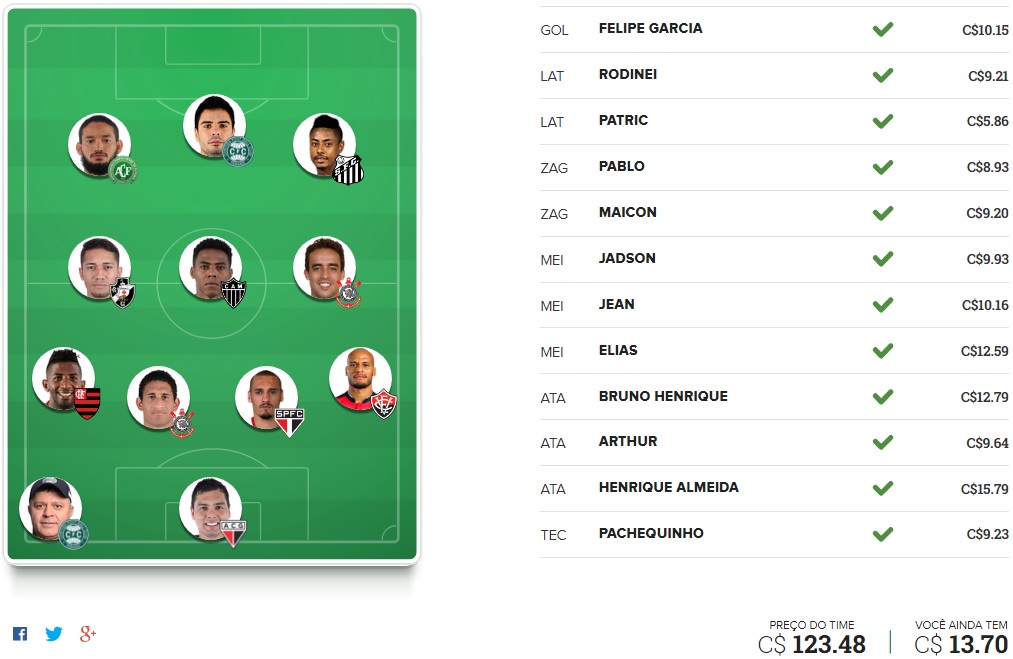 Bruno Henrique (Santos) é o escolhido para decidir o clássico paulista pelo lado do Peixe, que emplacou 2 vitórias seguidas. Arthur (Chapecoense) tem um gráfico de pontuação de encher os olhos, quando pintou como aposta por aqui não decepcionou e mais uma vez é o nosso indicado para fazer 1 gol no Vasco. Henrique Almeida (Coritiba) é o mais indicado do ataque do Coritiba, muito participativo, sofre faltas, ajuda na marcação e é bom finalizador.