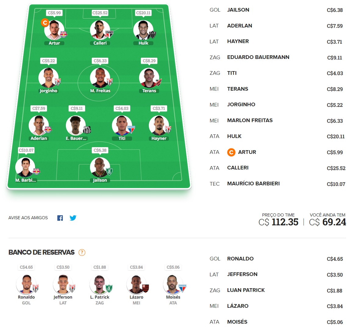 O time para valorizar apresentado acima pode sofrer alterações até o fechamento do mercado, em função de desfalques de última hora. Fique à vontade para emitir sua opinião, fazer comparações e citar outros nomes. Alertamos a todos que a nossa intenção não é a de sugerir um time perfeito mas sim montar um bom time dentro das propostas do quadro.