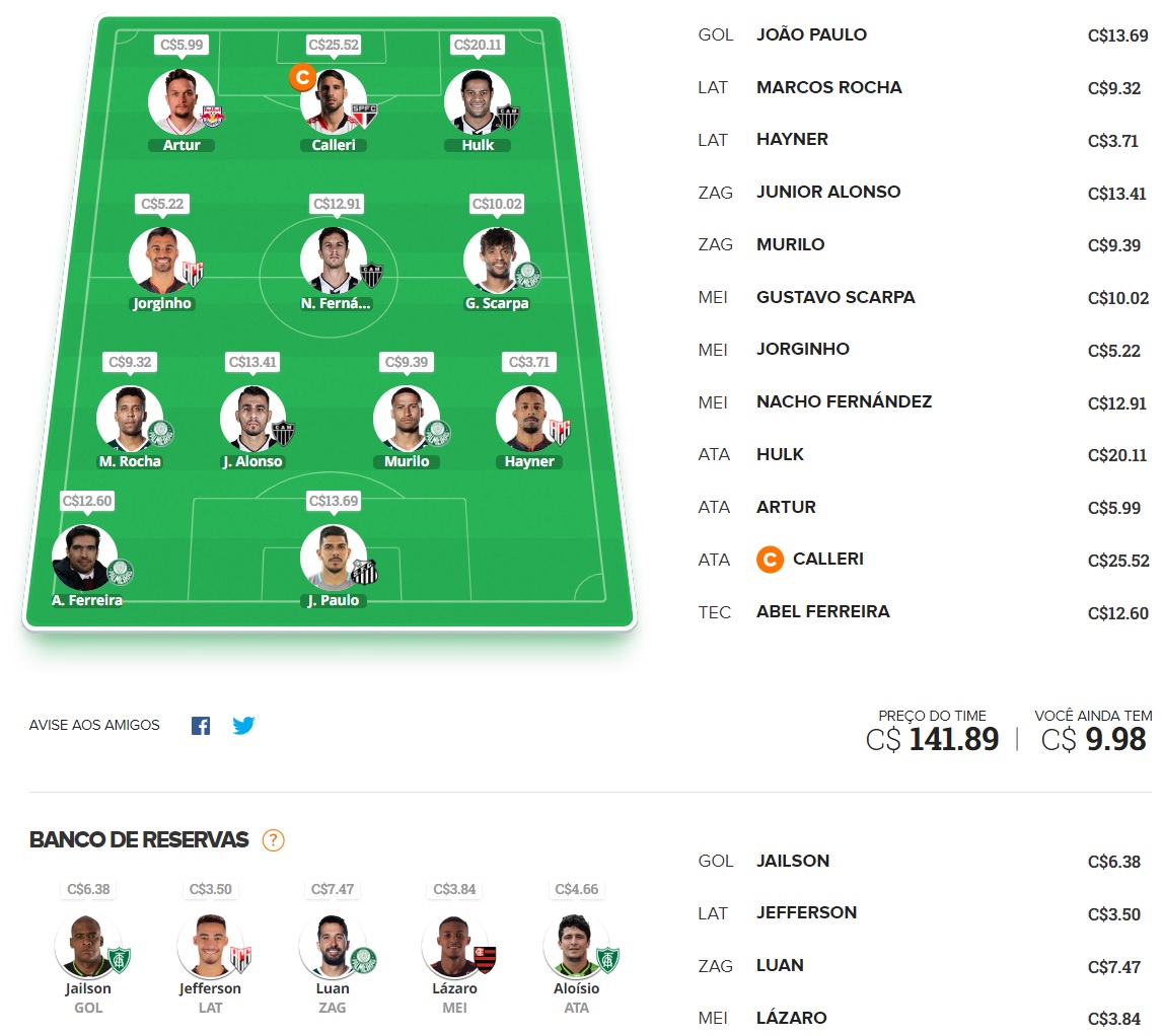 O ataque mítico vai naquela tradicional ousada com Calleri (São Paulo) de CAPITÃO. Hulk (Atlético-MG) é Hulk, uma hora vai dar mais uma cravada e passar dos 15 pontos. Já Artur (RB Bragantino) figura novamente no nosso quadro de apostas da rodada #10 para voltar a marcar gol no Flamengo no jogo de logo mais.
