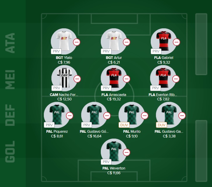 Essa rodada sem inventar, fechamento total com a melhor defesa do campeonato, lógico que isso tem riscos já que muita gente vai com o Palmeiras, mas buscamos alguns diferenciais na frente para lucrar nessa rodada #12, então Weverton é o goleiro, Piquerez e Garcia os laterais com Gomez e Murilo na zaga.