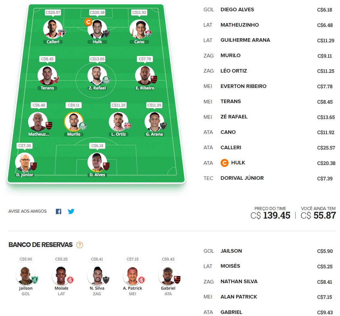 Em uma rodada que muitos pontuaram mal e perderam cartoletas, fechamos com 53.45 pontos e valorizamos C$ 5,45 cartoletas, totalizando agora C$ 195,32 cartoletas no total.