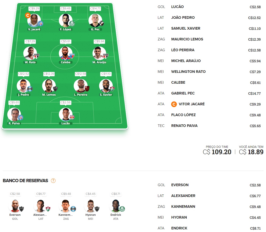 Ótima pontuação e ótima valorização na rodada #1 com 78.61 pontos e C$ 28,09 cartoletas na conta.