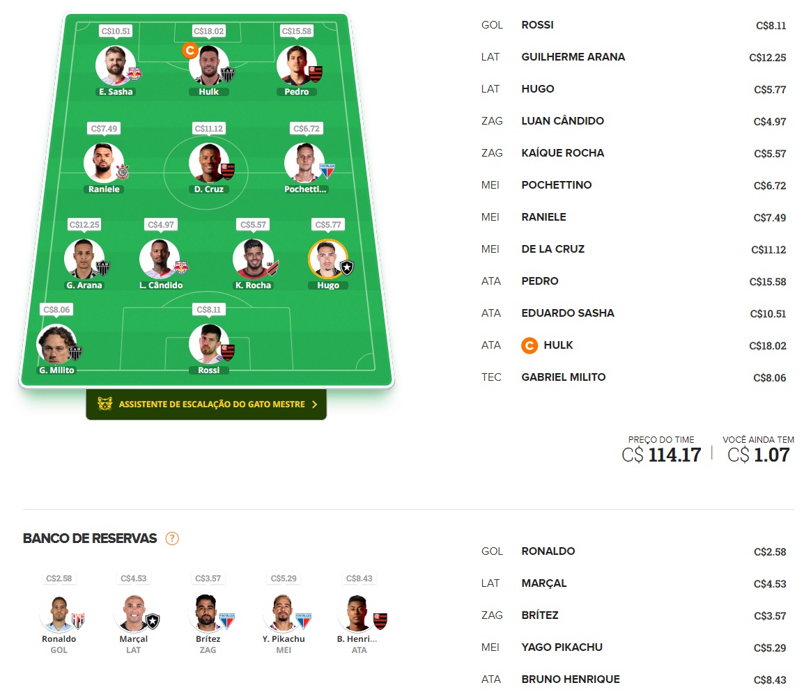 Como características do nosso time MITO, escolheremos alguns jogadores com maiores chances de ir bem, independente se atuam dentro ou fora de casa, porém cabem dois ou três jogadores diferentes para "temperar" e dar aquela ousada na escalação, por isso escolheremos um bom capitão e também algumas apostas.