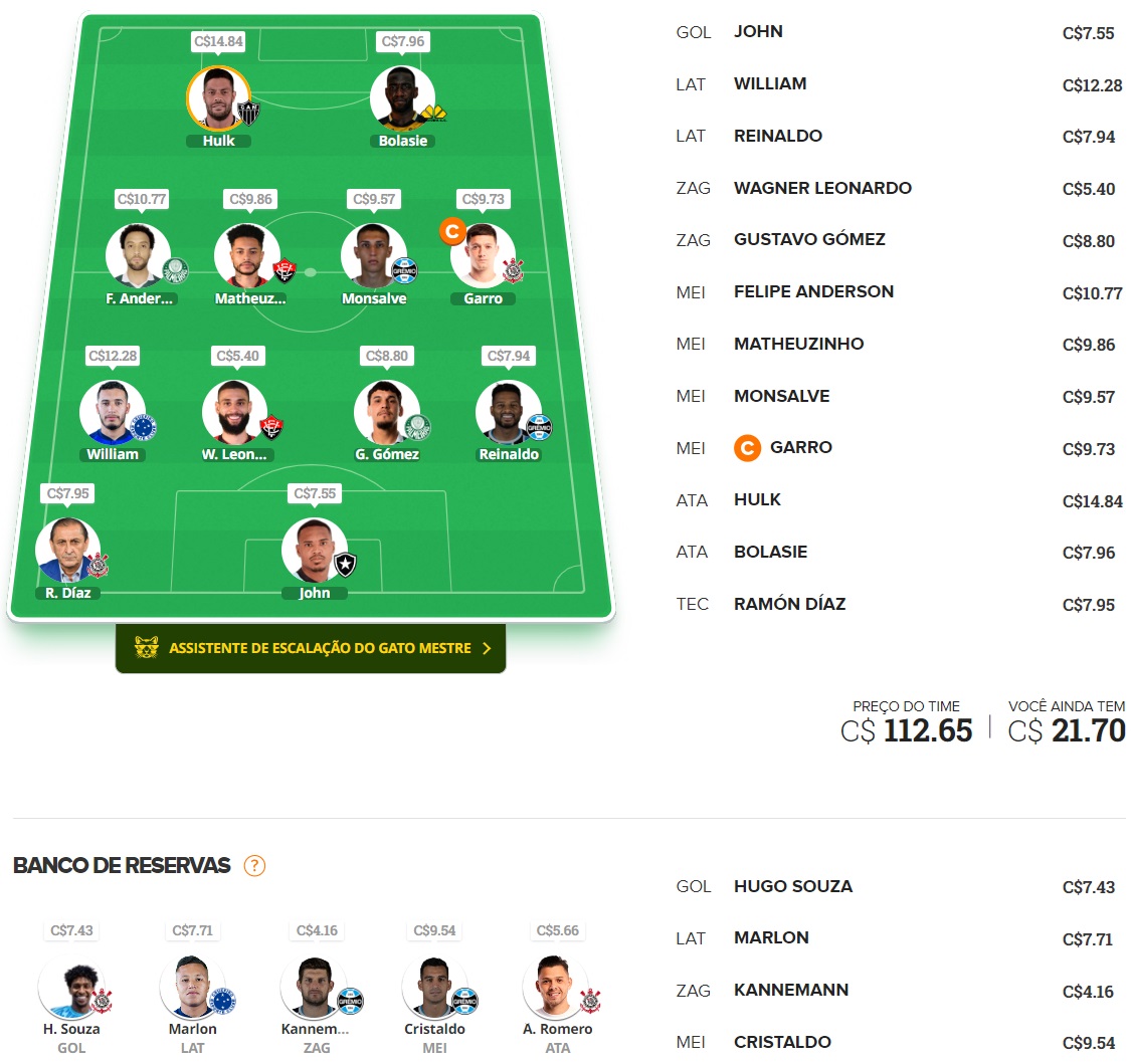 Como características do nosso time MITO, escolheremos alguns jogadores com maiores chances de ir bem, independente se atuam dentro ou fora de casa, porém cabem dois ou três jogadores diferentes para "temperar" e dar aquela ousada na escalação, por isso escolheremos um bom capitão e também algumas apostas.