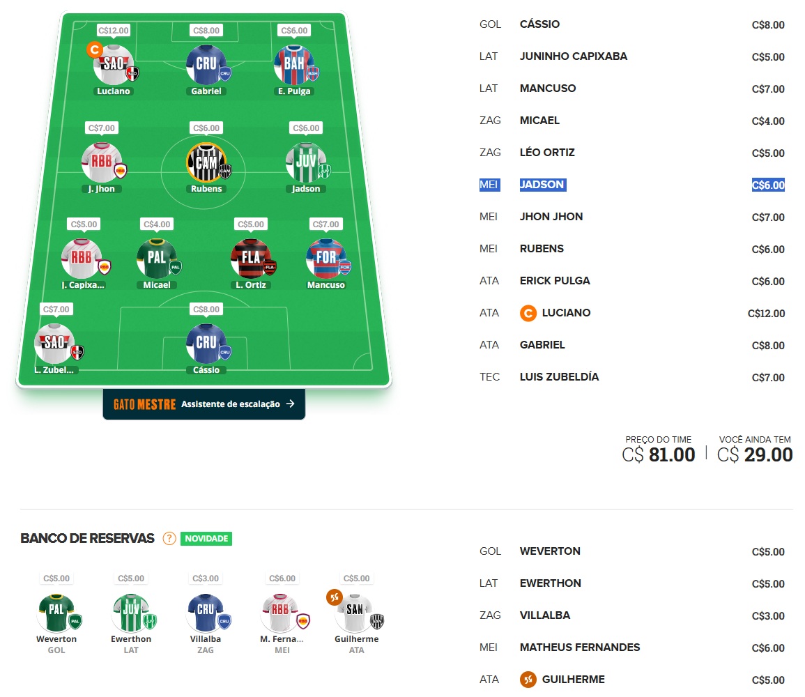 Como características do nosso time MITO, escolheremos alguns jogadores com maiores chances de ir bem, independente se atuam dentro ou fora de casa, porém cabem dois ou três jogadores diferentes para "temperar" e dar aquela ousada na escalação, por isso escolheremos um bom capitão e também algumas apostas.