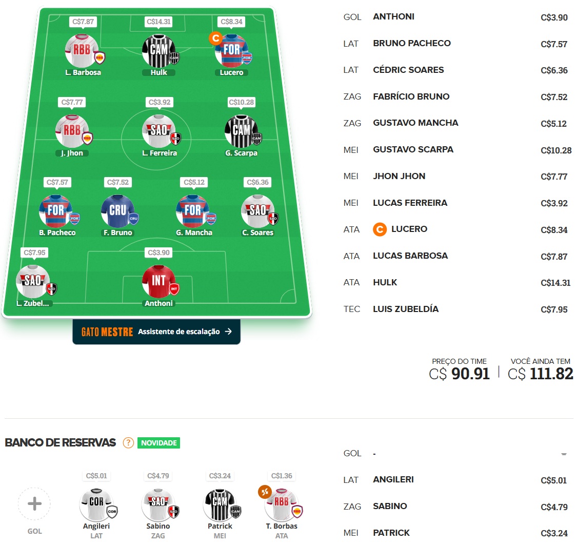 Valorização de C$ 2,29 cartoletas na rodada #11, totalizando agora C$ 202,73 cartoletas.