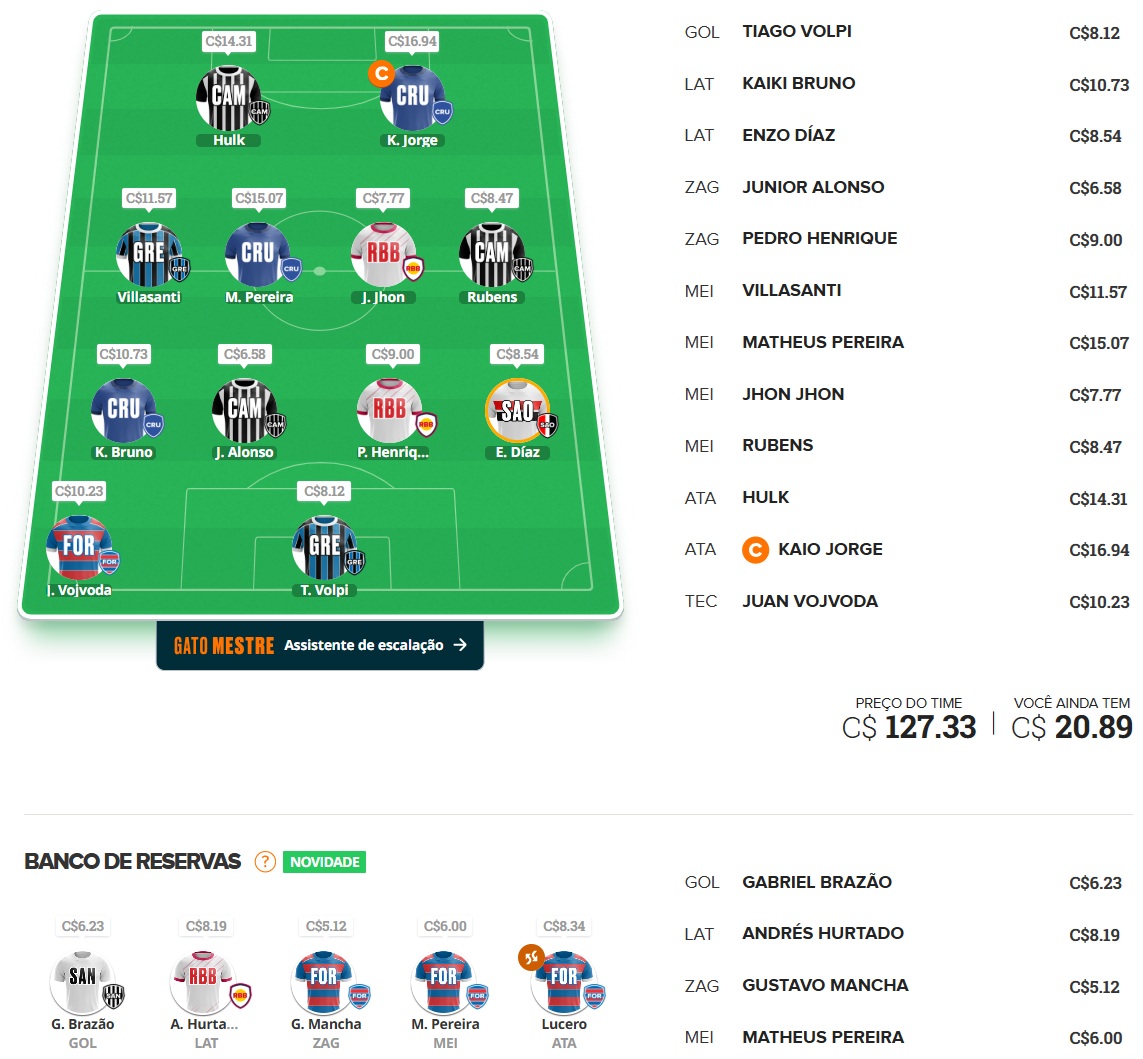 Como características do nosso time MITO, escolheremos alguns jogadores com maiores chances de ir bem, independente se atuam dentro ou fora de casa, porém cabem dois ou três jogadores diferentes para "temperar" e dar aquela ousada na escalação, por isso escolheremos um bom capitão e também algumas apostas.