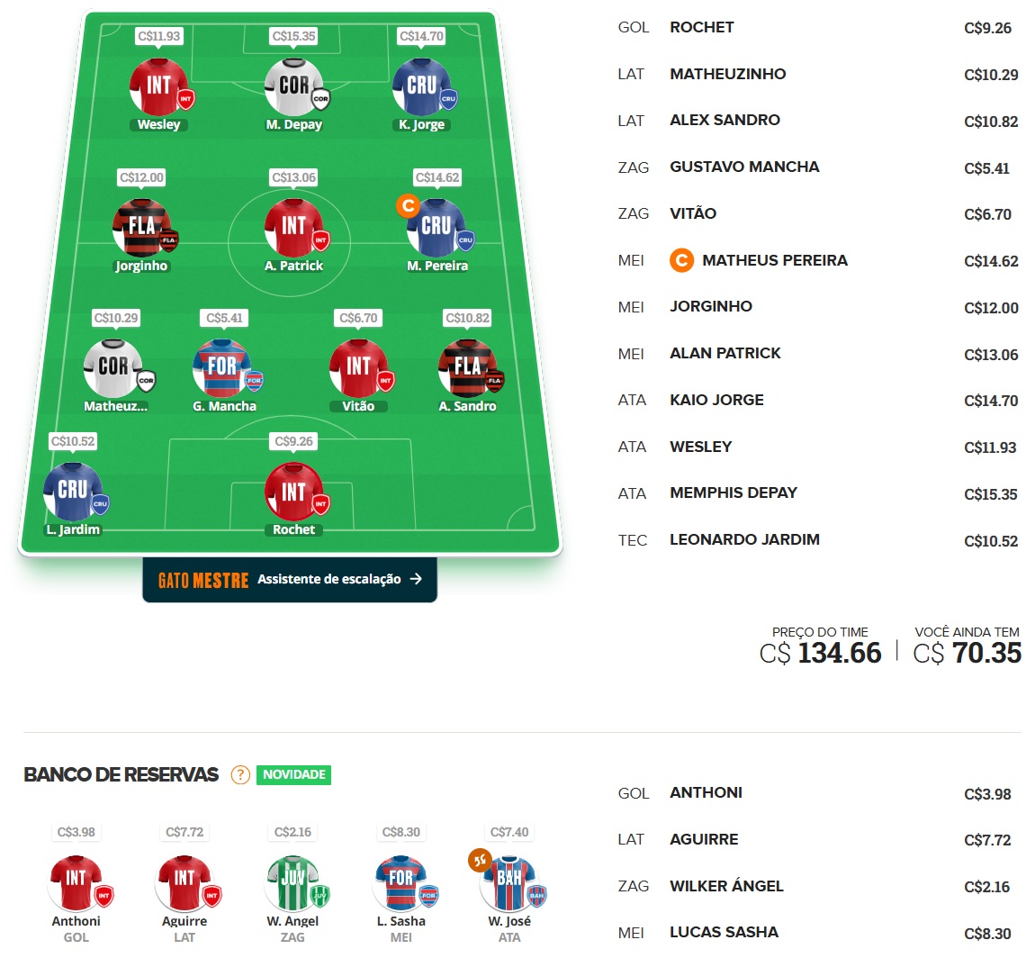 O time para valorizar apresentado acima pode sofrer alterações até o fechamento do mercado, em função de desfalques de última hora. Fique à vontade para emitir sua opinião, fazer comparações e citar outros nomes. Alertamos a todos que a nossa intenção não é a de sugerir um time perfeito mas sim montar um bom time dentro das propostas do quadro.