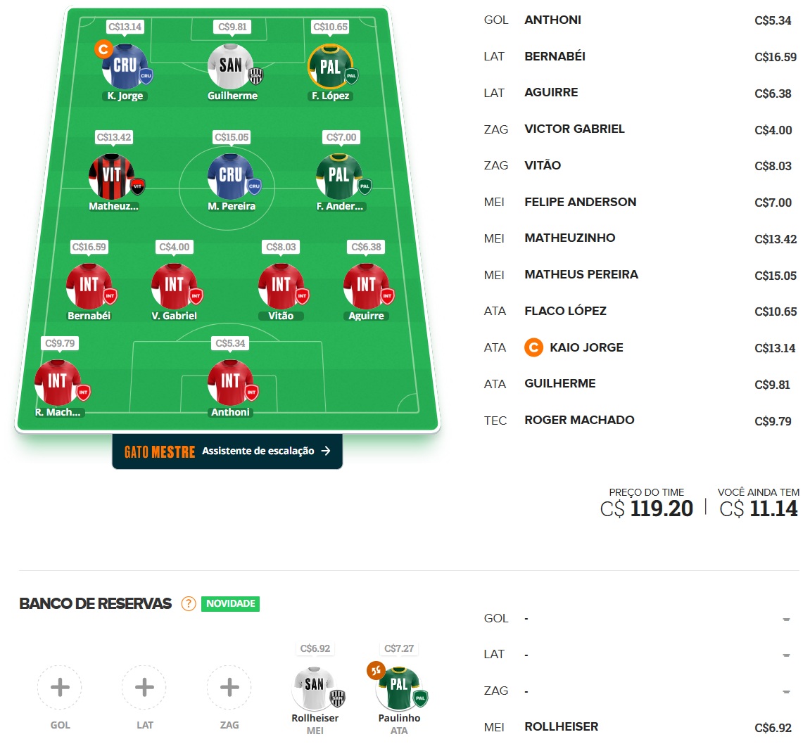Escalamos o nosso time com base no tutorial: Cinco dicas de como ganhar ligas tiro curto no Cartola FC. Caso você queira participar de ligas tiro curto, te recomendamos o Catimba Scores, que tem diversas ligas com premiações altas e vários valores de inscrição diferentes.