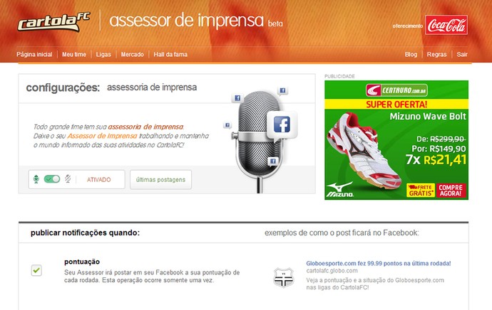 A função assessor de imprensa divulga no seu Facebook todas as novidades sobre a escalação, os troféus e os pontos conquistados pelo seu time, para seus amigos.