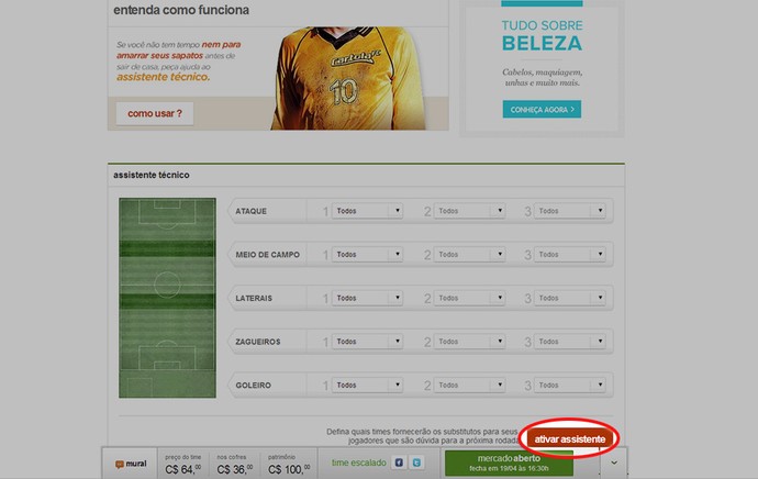 Para ativar esta função vá na tela inicial do Cartola FC, clique no ícone "Assessor de Imprensa", que fica ao lado da opção "Assistente Técnico".