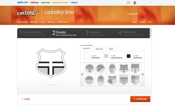 Em seguida, você terá que criar o escudo do time. Há diversos modelos básicos que podem ser customizados com cores diversas, adornos, brasões e siglas. Deixe o escudo do seu jeito e clique em "Continuar".