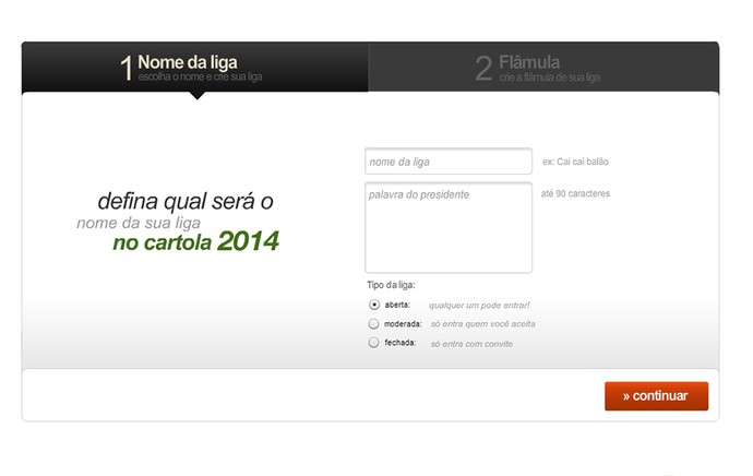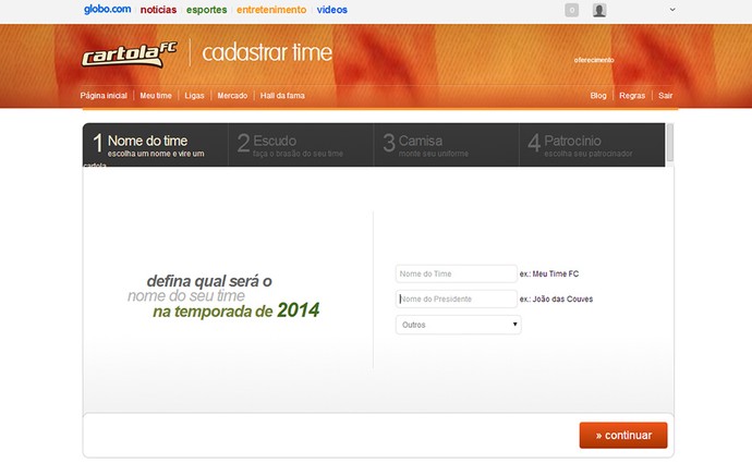 Depois de ativar o cadastro, a segunda etapa consiste na criação do nome do time, nome do Presidente e a indicação do seu time do coração. Com tudo preenchido, basta clicar em "Continuar".