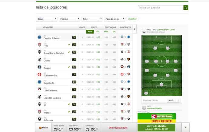 Uma página com os jogadores de todos os clubes do Campeonato Brasileiro aparecerá. Os atletas são alocados por ordem de preço. Para filtrar a lista, utilize as ferramentas localizadas abaixo do título "lista de jogadores".