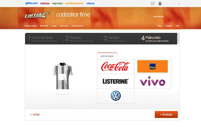 O último passo é escolher o patrocínio do seu clube. Escolha uma das cinco opções e clique em "Finalizar".