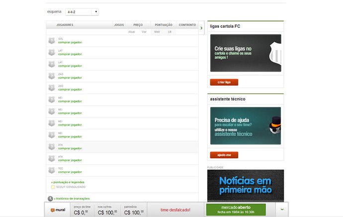 Abaixo aparecerá o seu plantel vazio. Clique na opção "comprar jogador" de acordo com a posição do atleta que você procura.